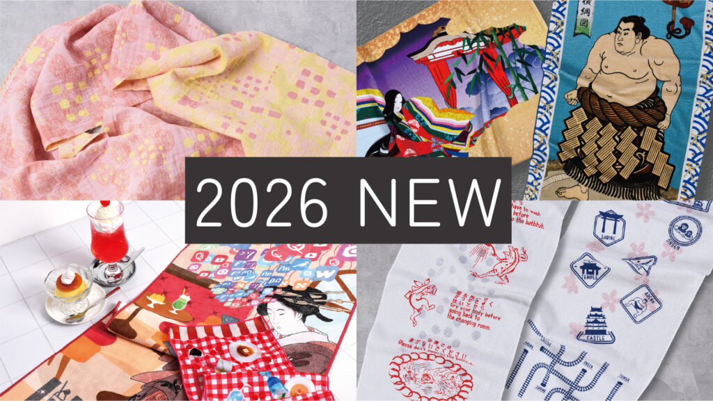 2026年のコレクションのテーマは「タイムレスジャーニー」 。懐かしさとかわいさを「いま」に重ねた新商品と時代と共に進化し続けるスタンダードなタオルたち。浮世絵を鮮やかに表現したバスタオルやレアな捺染と顔料プリントを重ねたロングフェイスタオル。上質なパイルやガーゼ素材のご紹介、用途にあったOEMのご相談も承ります。皆様のお越しを心よりお待ちしております。