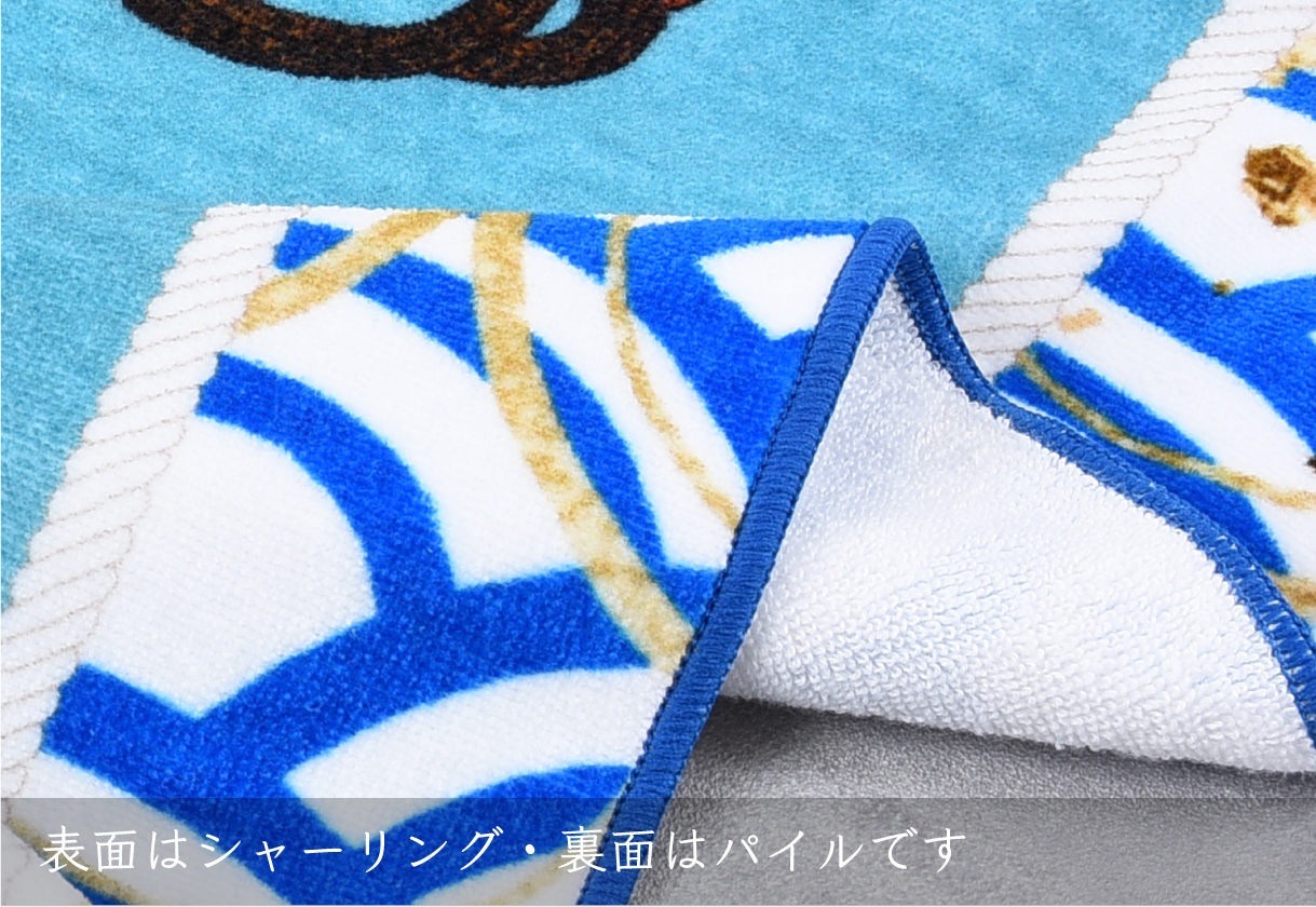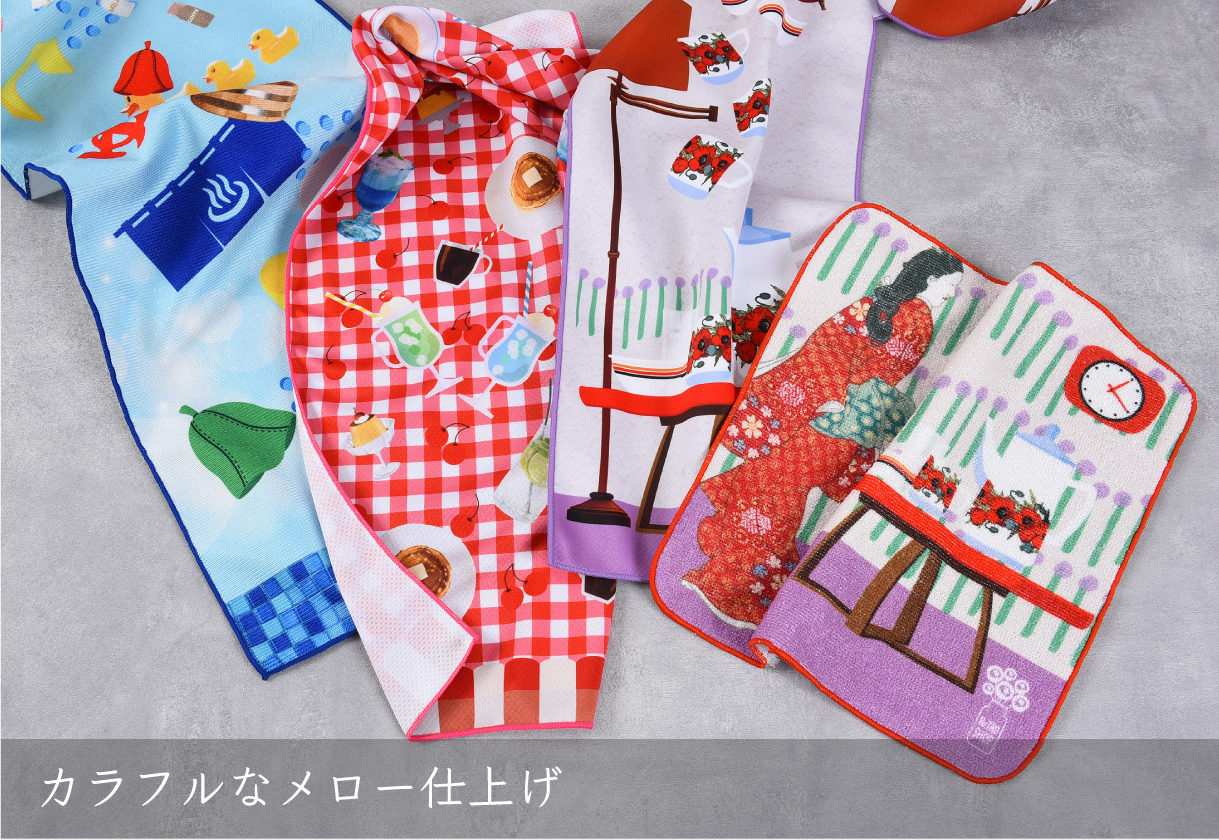 昇華転写プリントは写真やイラストの繊細な色合いを忠実にプリントできるため、高精細な表現が可能です。また、インクが繊維の奥まで浸透し洗濯や摩擦でも色落ちしにくく、鮮やかさが長持ちします。縁取りはカラフルなメロー仕上げで色多彩。タオルに華やかさと遊び心を添えることができます。専用の生地は用途にあわせてバリエーション豊富で、両面印刷対応の生地もございます。