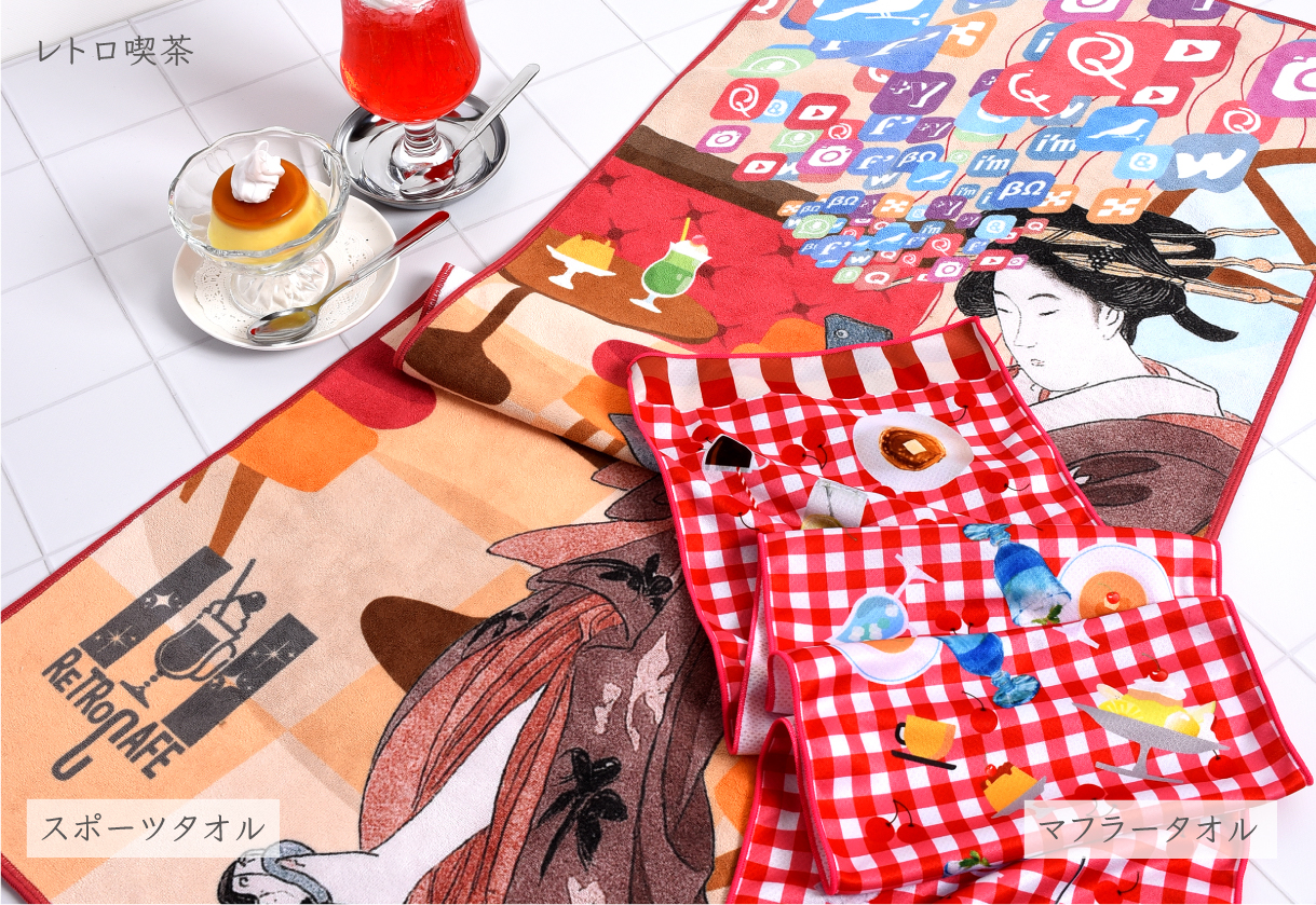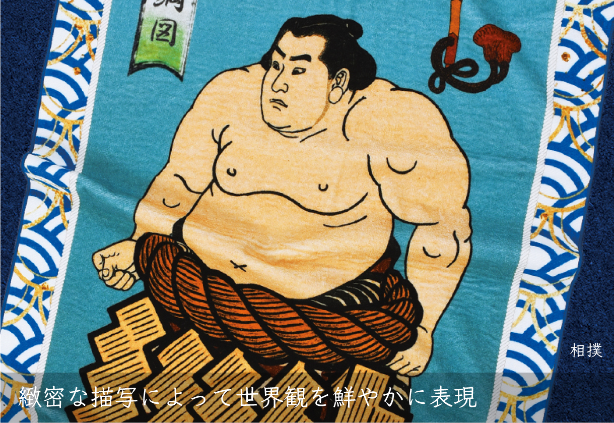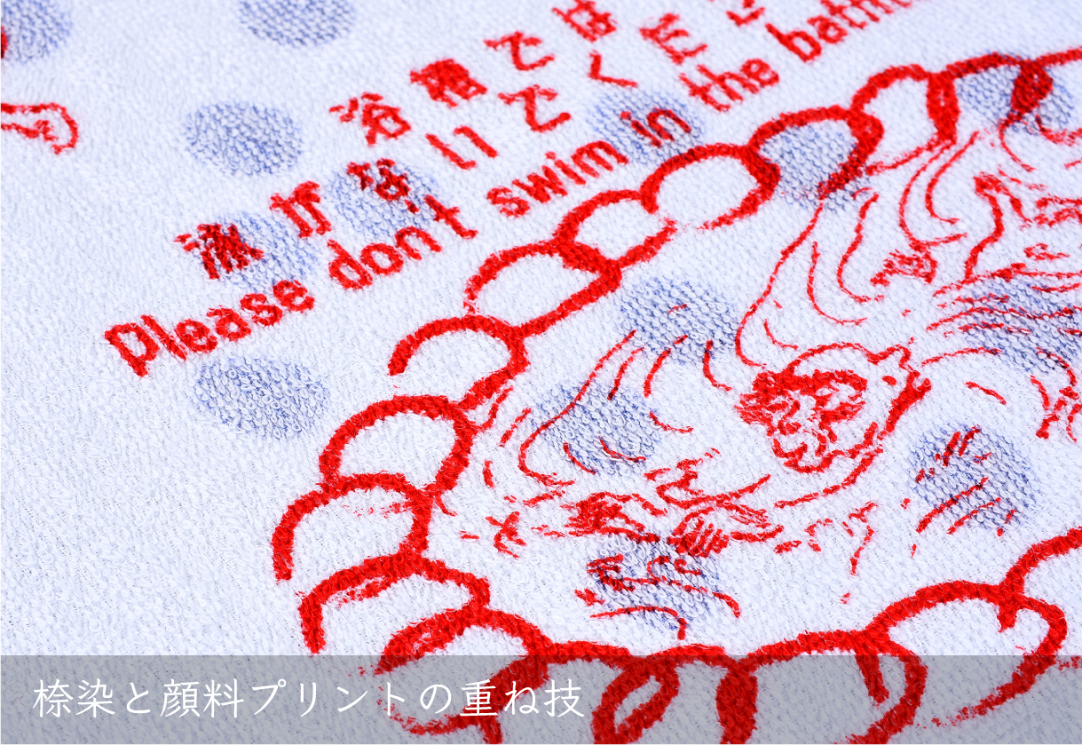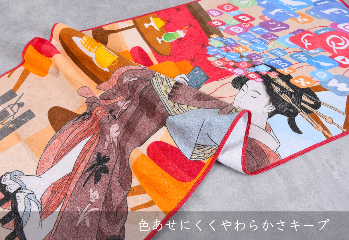 パイルの表面をカットしてつややかさと滑らかさを出したシャーリング加工のタオルは、最新の染料インクジェットの技法と大変相性がよく、デザインの色の階調や細やかな柄を忠実に再現することができます。 古典の柄がより鮮やかに、臨場感あふれるアートタオルになりました。