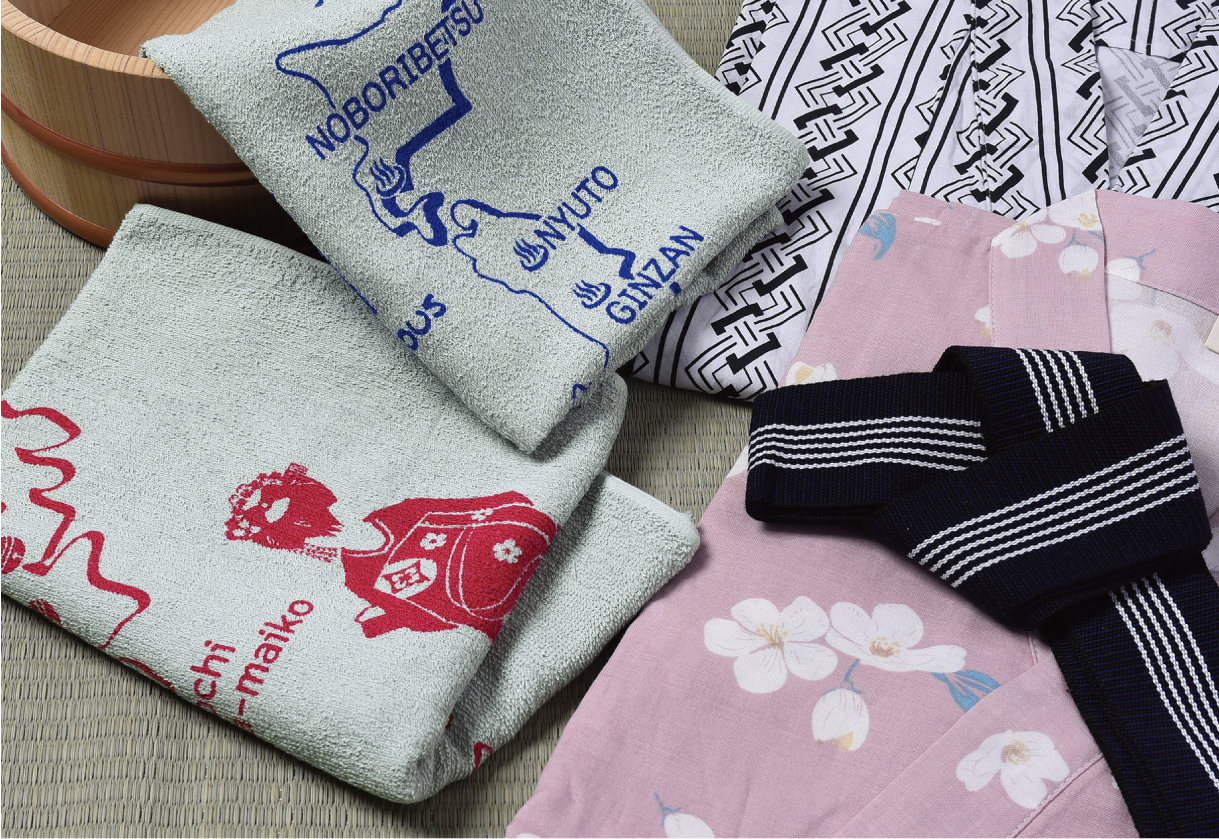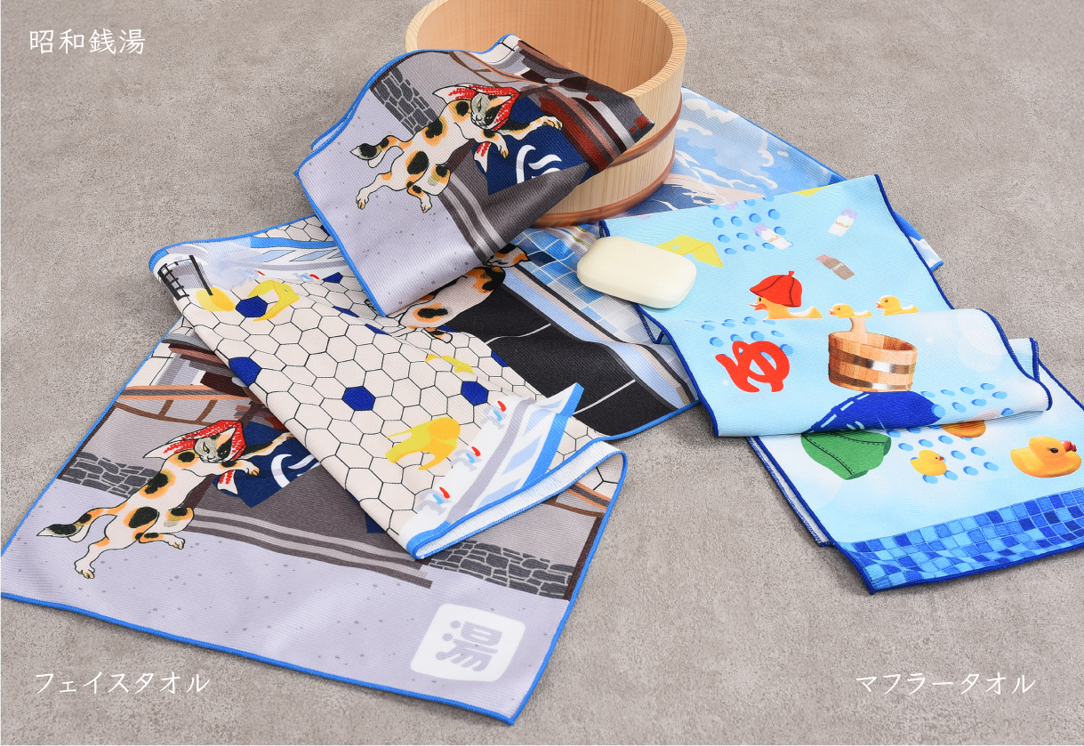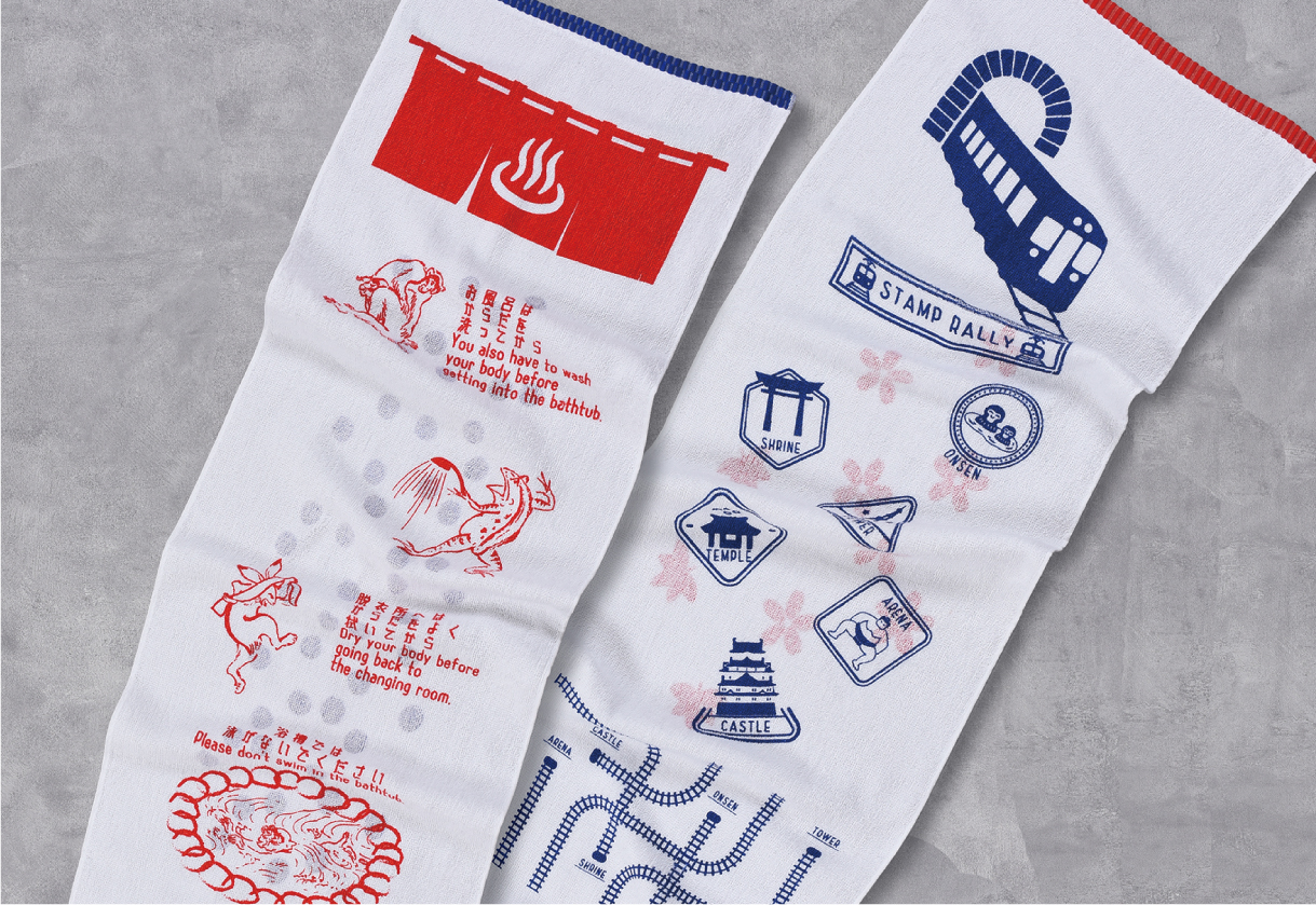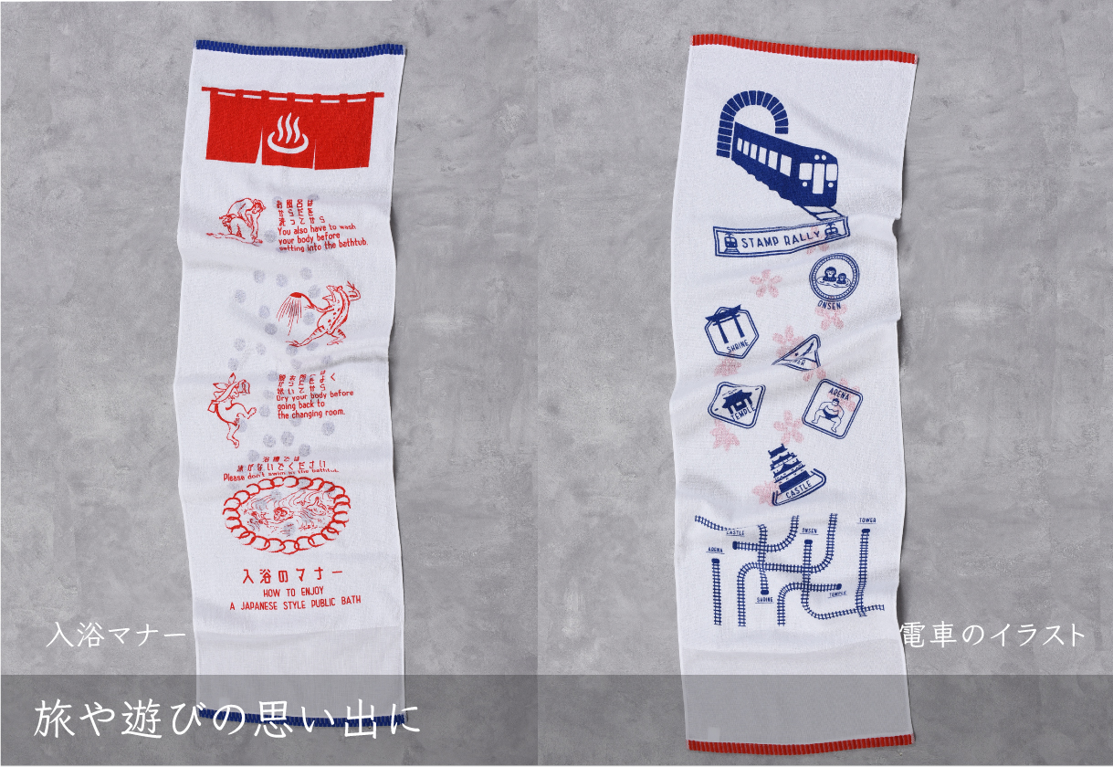 銭湯の入り方をユーモラスに描いたタオルや、電車のイラスト入りタオルを旅の思い出にどうぞ。
