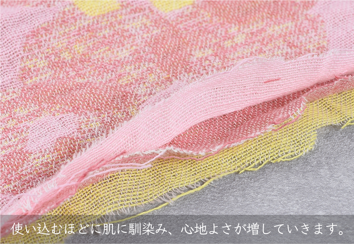 㮈染は緯糸だけが染まる特殊な加工で、パイルには染料が入らず霞んだような繊細な表現になります。一方でプリントはパイルの表面にくっきりと印刷されているので、両者の技法が重なり深みあるタオルになりました。又、㮈染部分はぬれると柄が浮かび上がるので使いながら表情を楽しめるのも特徴です。㮈染の加工は今ではできる工場が減り、希少な加工法となっています。